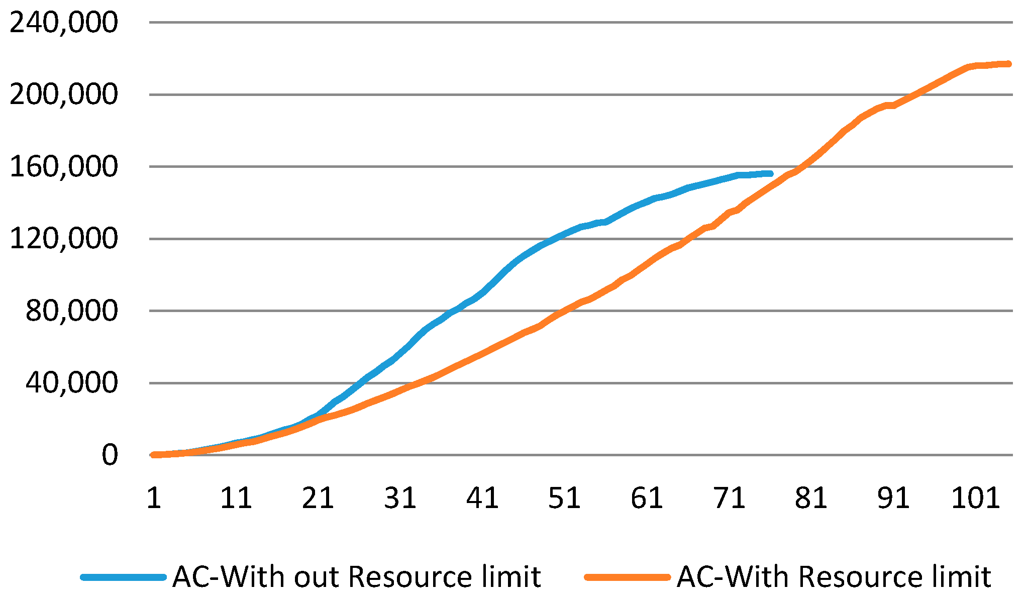 Taking into consideration resource constraints, both the project time and cost will increase. Figure 16 shows the resulting S-curve of the project for both with and without resource leveling.