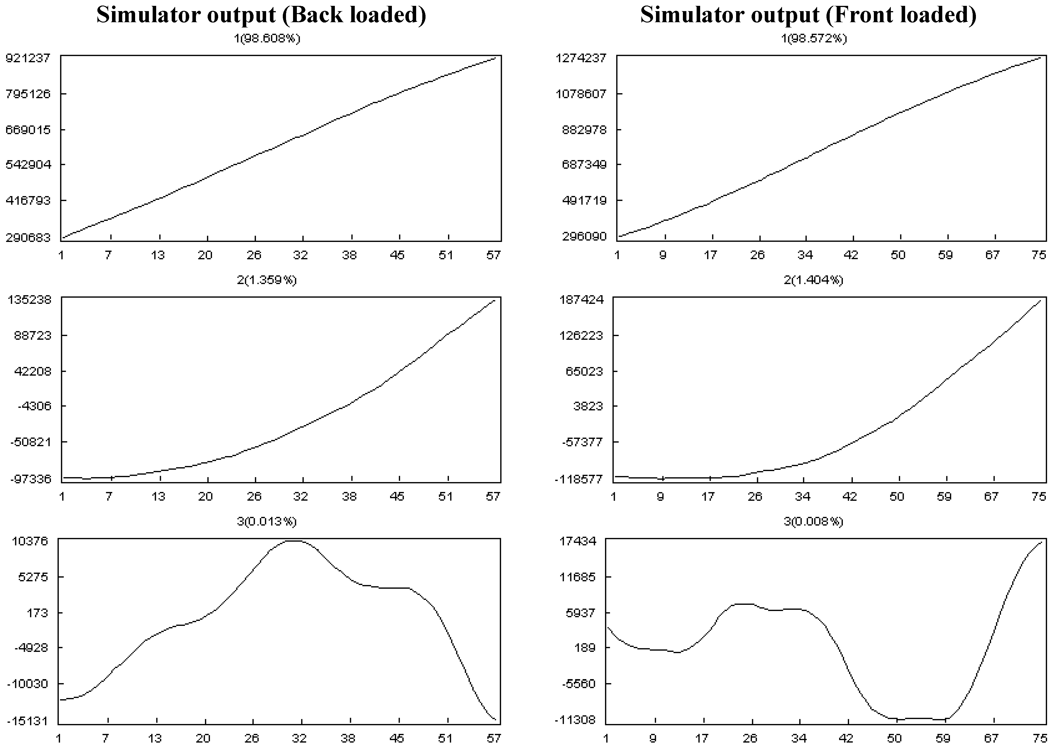 In this section, the simulator is run in two different settings of work contour: front loaded and back loaded and with the assumption of resource leveling. Principal components related to the first three eigentriples of the resulting time series are presented in Figure 18.