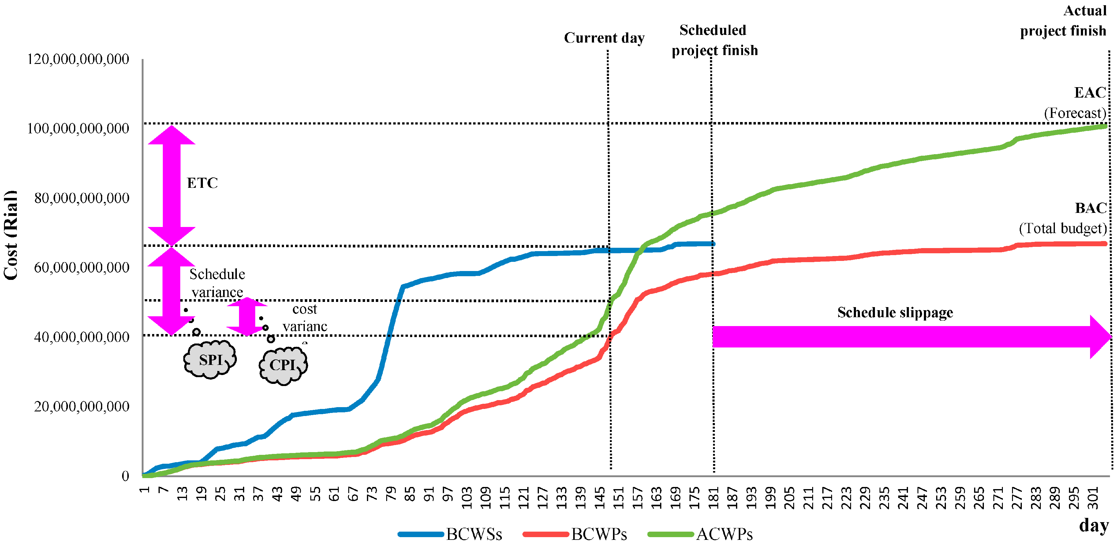 During the life cycle of a project, a point of reference is needed for EVM to measure the project’s execution periodically. This fixed reference point is supplied by its project’s baseline schedule. In order to obtain the time and costs of a project performance, the three key parameters of EVM must be compared to each other and the time and cost performance measures as below: