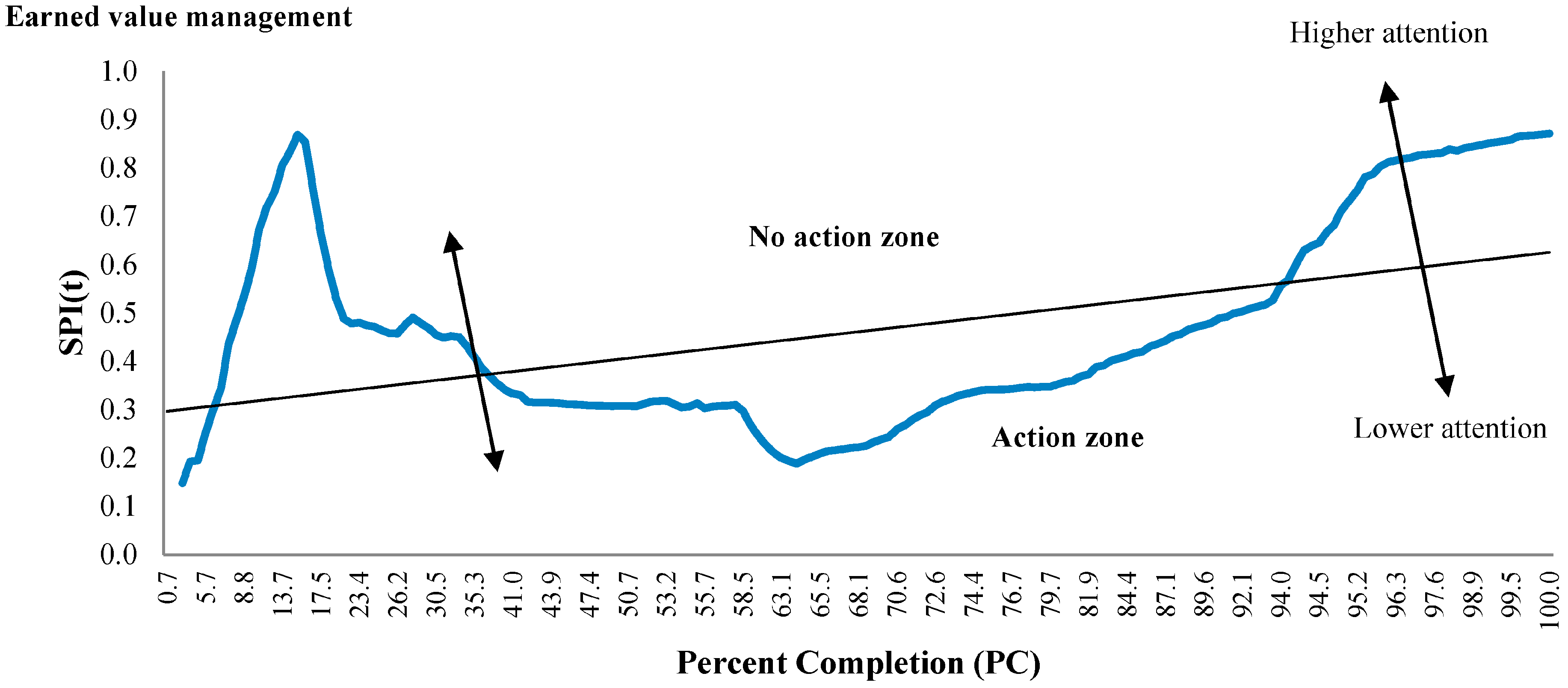 Lipke questioned the classic metrics of SV and SPI previously used since they failed to reliably forecast ending point of time of a project [10]. In this study, however, a time-based measure was designed to cope with false and unreliable behavior, which is dependent on similar principles to those of earned value method, but which renders the money-related metrics into a time aspect. He transformed the time performance metrics SV and SPI to SV(t) and SPI(t) and indicated that they showconsistent and reliable behavior throughout the project life cycle.