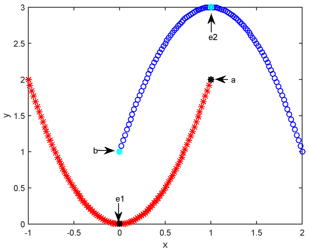 To discuss the necessity of introducing path-based similarity, we first give an illustrative example in Figure 1. In the figure, there are 202 samples distributed with two curves and each curve correspond to a cluster. Samples “e1” and “e2” are two exemplars identified by running APC on the toy dataset plotted in the figure. From Figure 1, we can clearly see sample “a” is closer to exemplar “e2” than to “e1”. Based on the non-exemplar samples assignment rule of APC and adopted similarity in Equation (1), non-exemplar sample “a” will be assigned to the upper cluster whose exemplar is “e2”. Similarly, “b” will be viewed as a member of the lower cluster whose exemplar is “e1”. However, from Figure 1, we could say “a” and “e1” should be in the lower cluster, “b” and “e2” should be in the upper cluster. This occurs principally because APC assigns non-exemplar samples to a cluster based their distance (or similarity) from the exemplar (or center sample) in each cluster. Although this rule is widely used in center-based clustering techniques (i.e., k-means and k-median [26]) and other variants of APC [16,17], the rationality of this rule for samples distributed with complex structure is not as well as expected. Our additional examples in the following Experiment Section further confirm this issue.