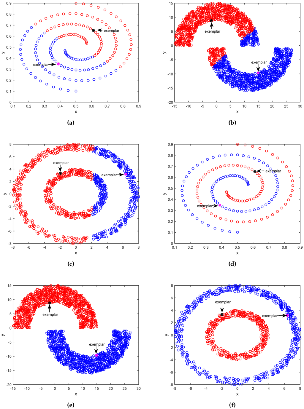 In Figure 2a, we can see APC equally cuts two spirals and does not identify the cluster structure of samples. In Figure 2b, APC correctly groups most samples, but it still wrongly assigns some samples. In Figure 2c, APC divides two circles into two semi-circles: left and right semicircles. Obviously, APC does not correctly discover the underlying cluster structure of samples. The reason is that after finding out center samples (or exemplars), APC employs negative Euclidean distance between non-center samples and center samples, and assigns non-center samples to their closest center samples. The Euclidean distance and assignment rule ignore the underlying structure of samples, especially for samples distributed with complex structures. On the contrary, in Figure 2d, APC-PS accurately groups samples into two interwound spirals. In Figure 2e, APC-PS precisely assigns samples into two different half-moons. In Figure 2f, APC-PS also perfectly divide samples into two circles without any mistake. Different from APC, APC-PS correctly reveals the underlying cluster structure of these three datasets.