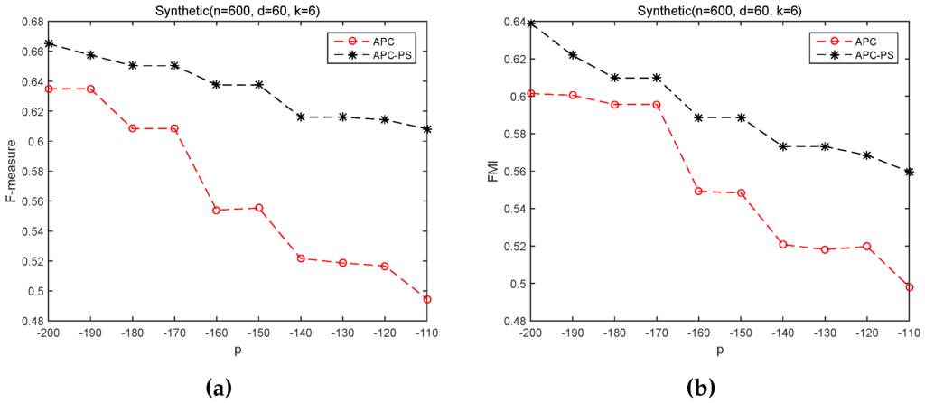 APC and APC-PS on Synthetic control chart dataset under different values of p. (a) F-measure; (b) FMI.