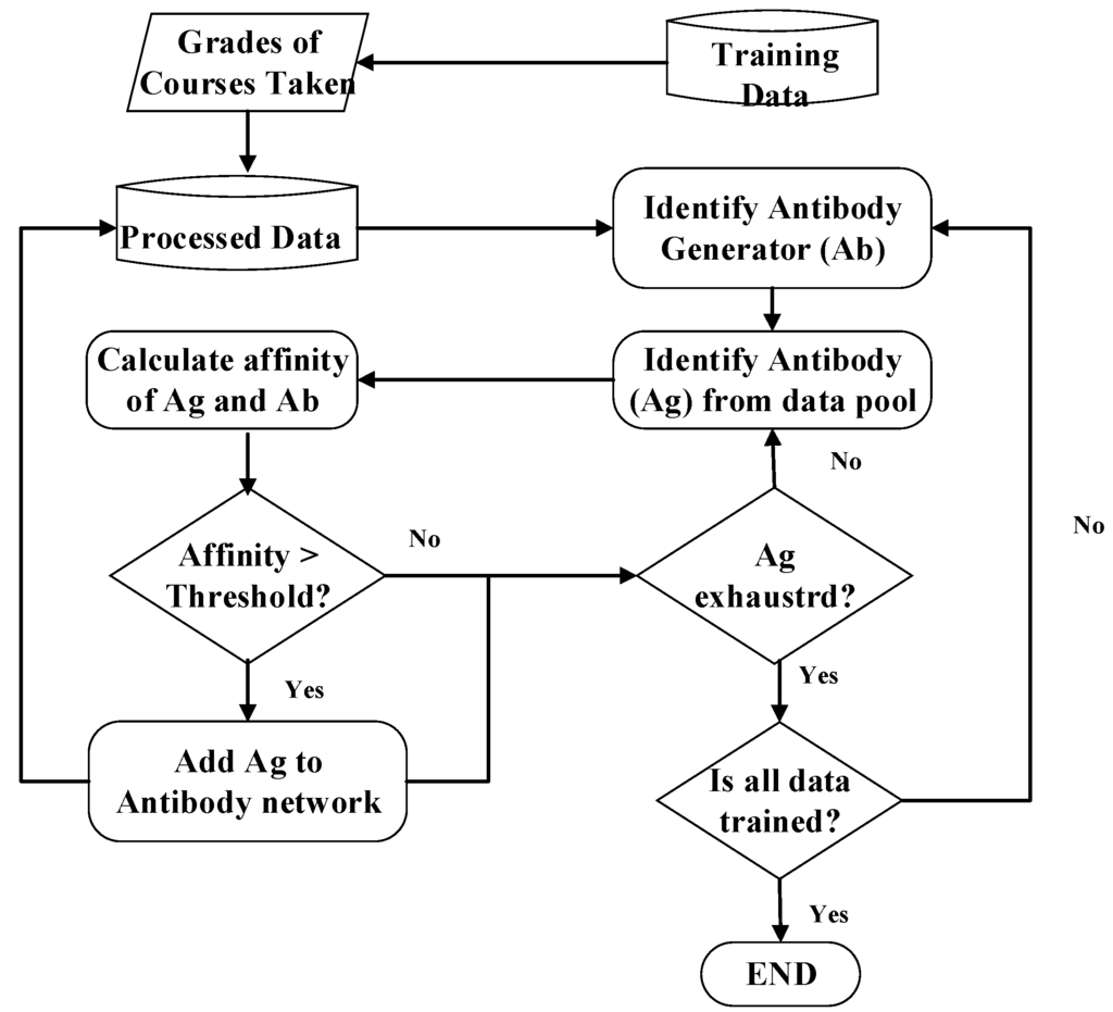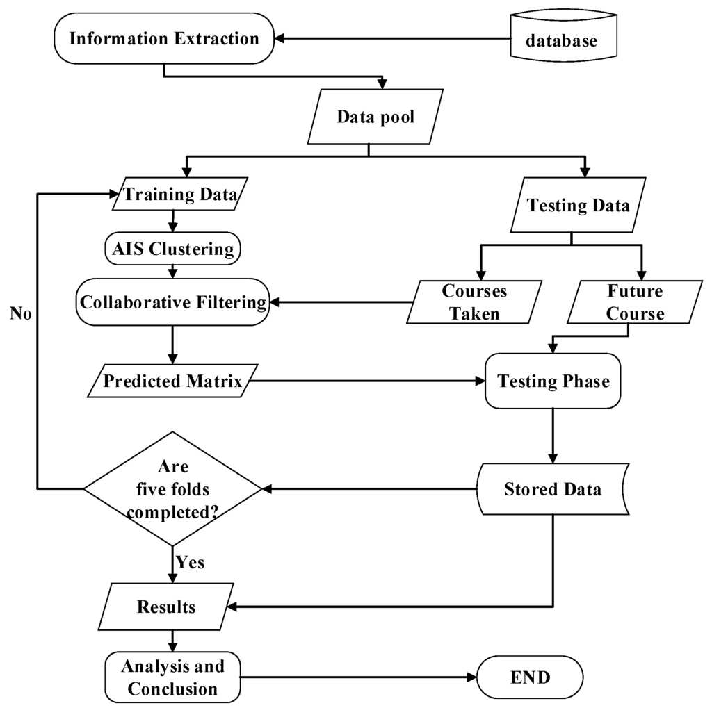 A Flow Diagram of the procedure for the design of the course recommendation system is shown in Figure 1. After the information extraction, the student course data and course grades are retrieved from the school database. Then, in the training phase, student data are defined as antigens, and weighted cosine similarity is used to assess the affinity between antigens and antibodies to find the relations between the data for clustering. In the testing phase, the collaborative filtering method is applied on the data cluster to predict the rating for the course. Analysis is done based on mean average error and the generated confusion matrix. We then make suggestions based on the students’ expected grades and the professors’ rating for the course.