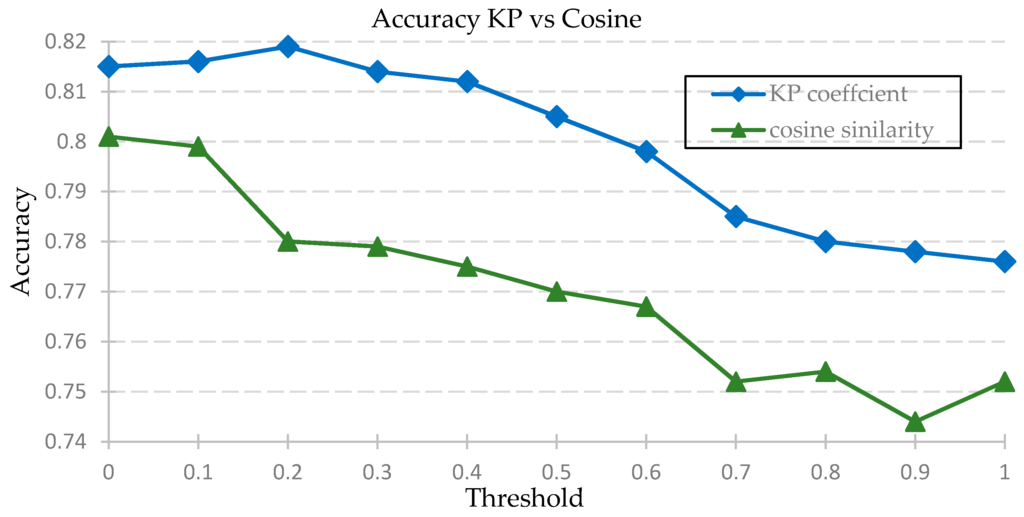 - For the Karl Pearson (KP) and cosine similarity clustering functions, the threshold was incremented by a step size of 0.1, from 0 to 0.8, and the resulting predicted matrix was tested against the actual outcomes. The test was conducted two ways. The comparison of results is shown in Figure 4 and the Figure 5 is shown the comparison of accuracy.