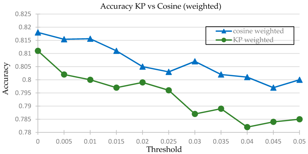 - For the weighted Karl Pearson and weighted cosine similarity clustering functions, the threshold was incremented by a step size of 0.005, from 0 to 0.4, and the results compared. The comparison of results is shown in Figure 6 and the Figure 7 is shown the comparison of accuracy.