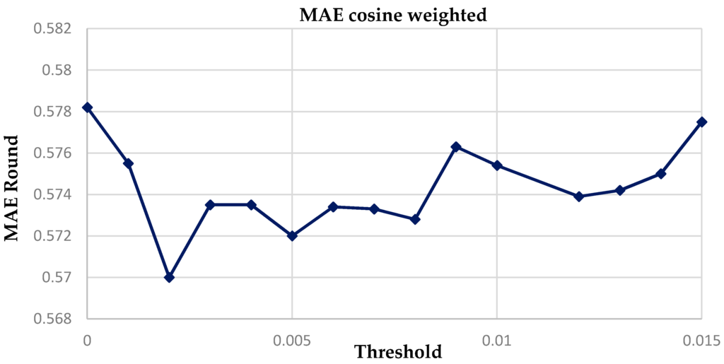 Finding threshold value with least MAE for weighted cosine function.