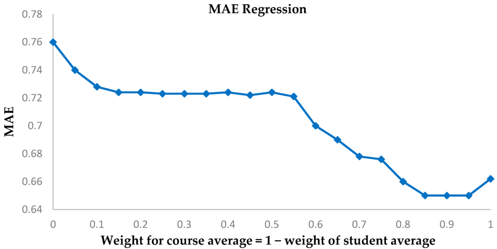 MAE for a linear regression for predictions using different weights for student and course average.