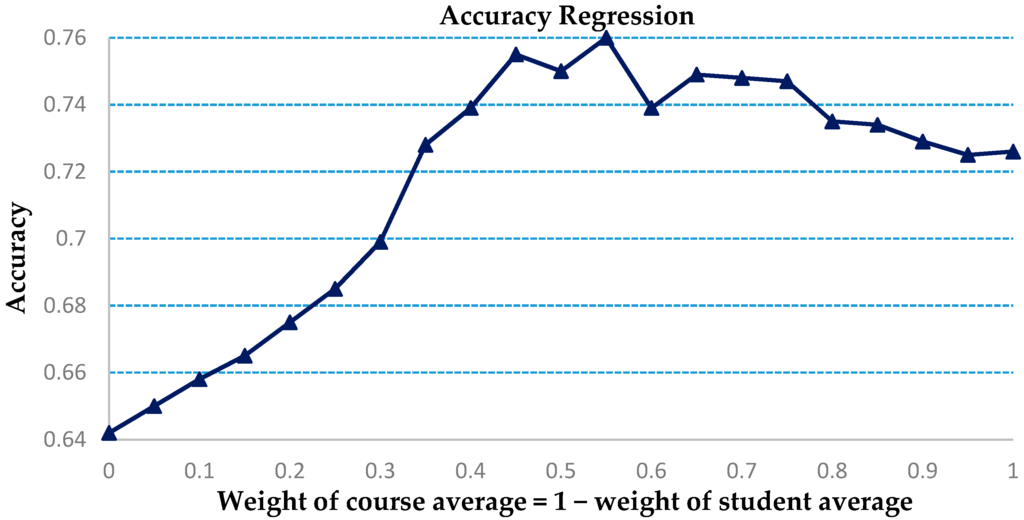 We assume a linear model for the prediction of a students’ grade in a future course, based on the student’s mean performance in his/her present courses and the average grade of the future course. The sum of the weights assigned equals one and is tested for different weights. The results for accuracy and MAE are plotted for a five-fold analysis. The weight for course average is increased in steps of 0.05. The tests carried out are for ensuring accuracy in predicting whether the student’s grade is below grade 3. The related results are shown in Figure 9 and Figure 10.