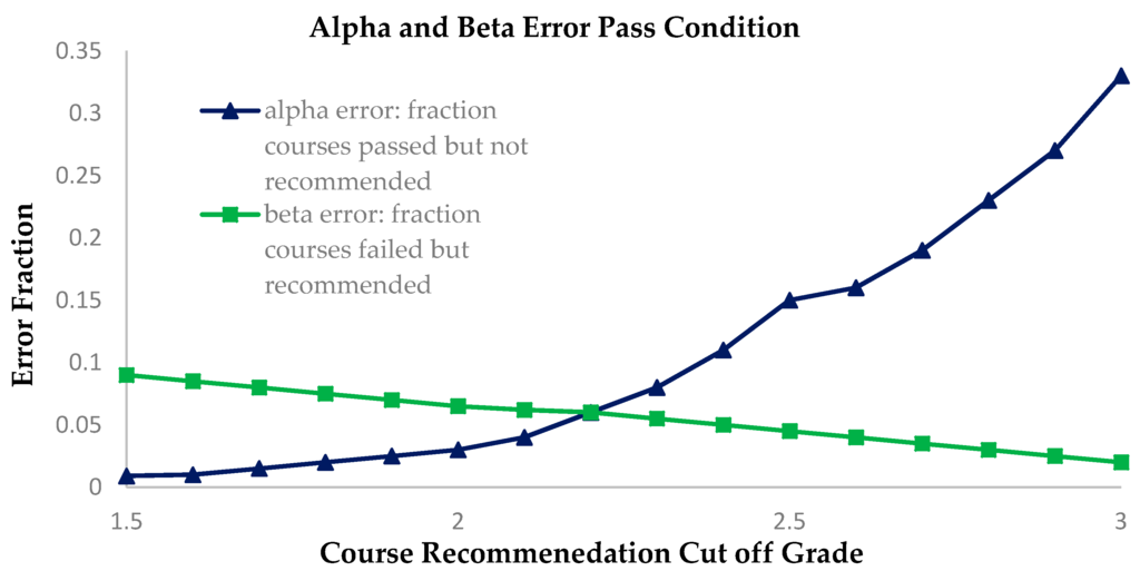 We see that our method provides low values of error for a range of cutoff scores. Passing a course is a very important factor for a student. Hence it is essential to reduce the beta error for the students. This can be achieved by having a high cutoff grade for the recommendation system. However, this increases the alpha error of the system where we fail to recommend those courses in which the student passes.