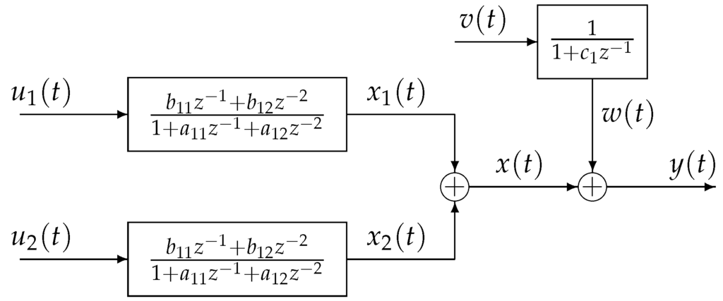 Consider the industrial process with colored noise, which has two inputs and one output as shown in Figure 2 and described as