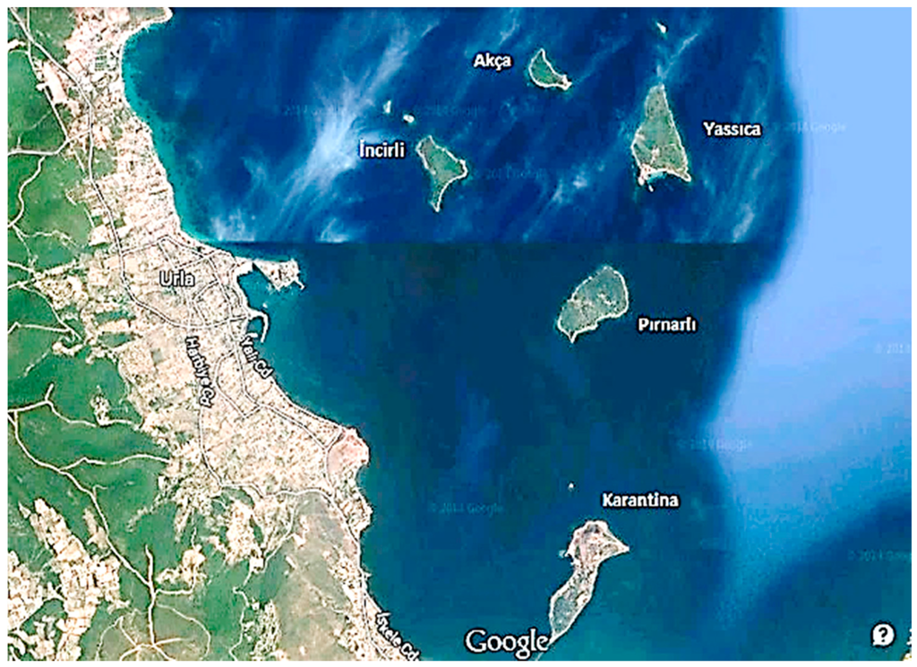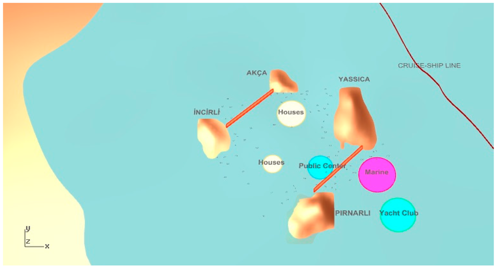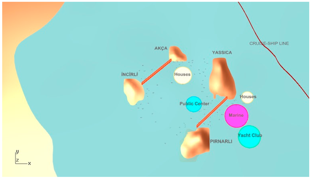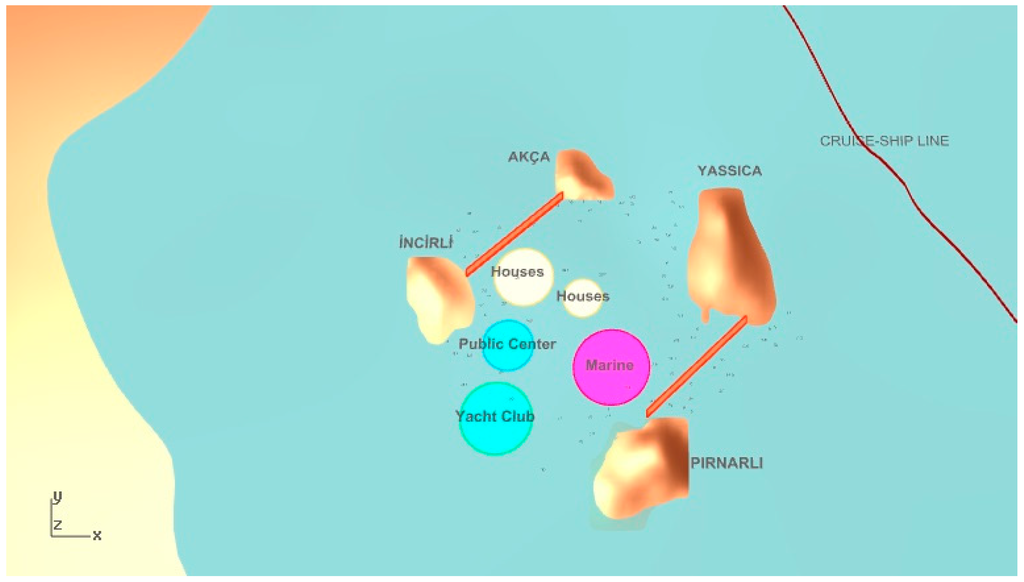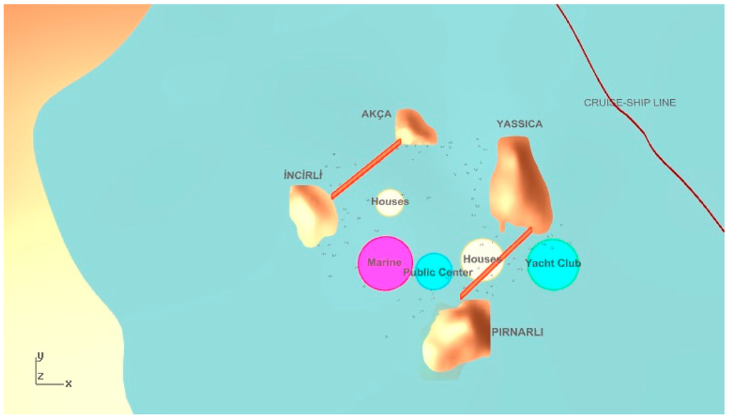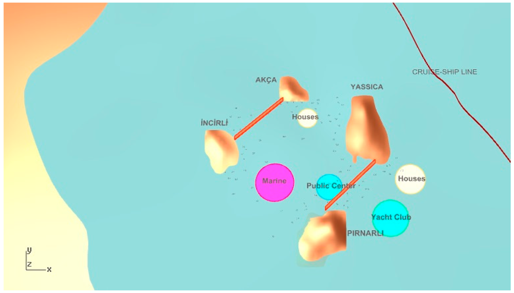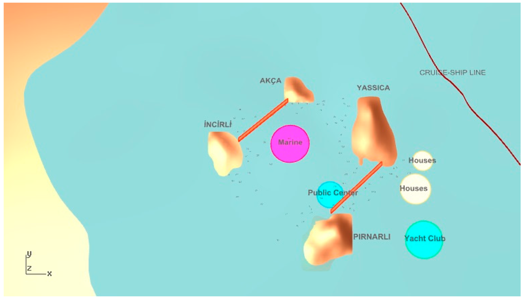As mentioned above, the problem in this study is concerned with the establishment of a floating settlement between four islands in the studied region. We consider four islands (Akça, Yassıca, Incirli, and Pırnarlı), with their locations shown in