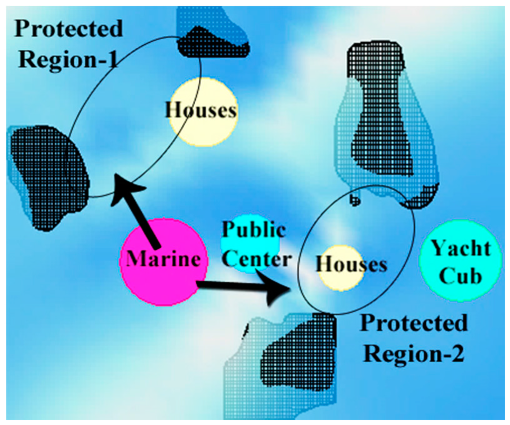 As the second objective, wind protection needs to be maximized for living spaces, such as housing spaces and a yacht marina. Through on-site inspection, we have determined that the area is characterized by a dominant wind coming from the northeast or southeast. For this reason, close offshore islands should protect other islands close to the coastline, and vice versa. Protected regions are determined as secluded areas between each pair of islands. Thus, it is desirable to locate the sensitive functions, namely housing and a yacht marina, near these protected regions. For instance, in
