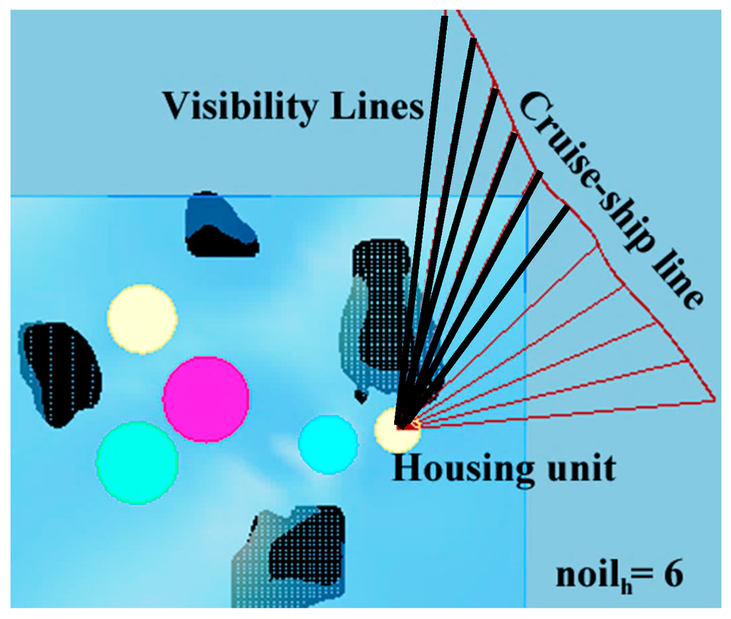 Figure 3. If the trajectories intersect with the close offshore islands, it is concluded that the function is not visible from the particular point. By tracing multiple visibility trajectories along the cruise ship course, we may obtain a figure of the overall visibility of the settlement functions. We thus focus on maximizing the visibility figure, calculated as described above and shown in Equation (14), for the relevant functions in the settlement. For example, the number of intersected visibility lines with the close offshore islands is six for a housing unit in