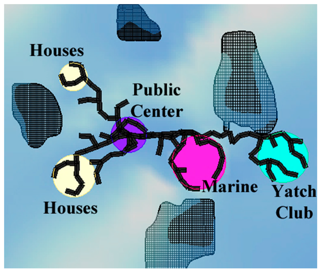 In our model, we determine the overall accessibility of the public space from all other modules as in Equations (1)–(3) and the proximity between the yacht club and the yacht marina as in Equation (4). These accessibility measures in terms of distances are given as follows: