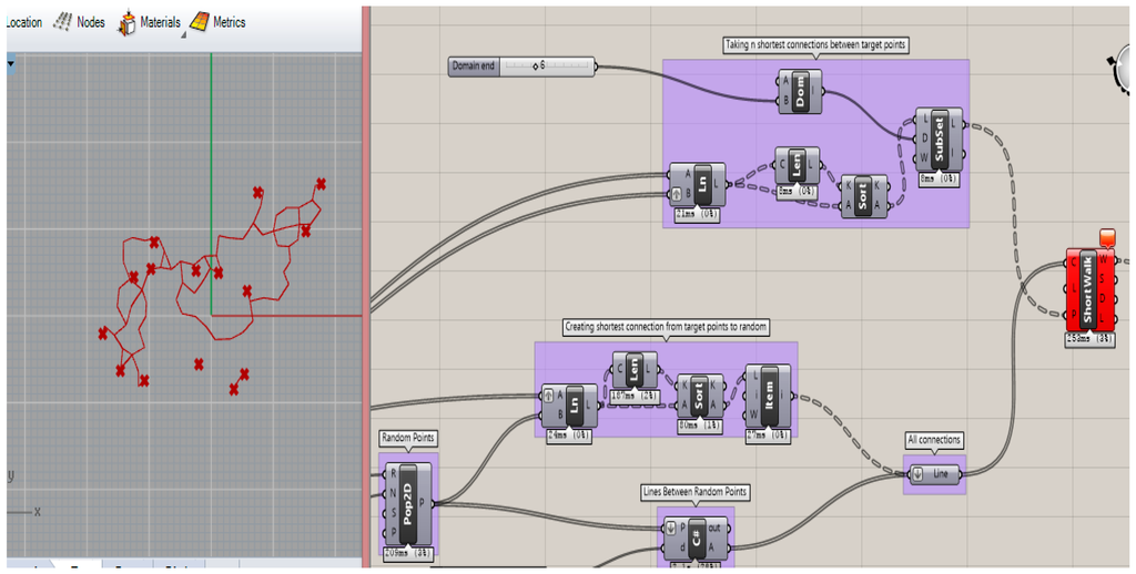 In the generative model, the coordinates of the functions are defined first, then the functions are demonstrated with the circles with their specific areas. In the second stage, objective functions are formulized in the GH model. After setting up the constraints, the MOHS algorithm is implemented as a plug-in for the GH environment, as mentioned previously. After choosing a design from the set of design alternatives handled by the optimization, the shortest walk component was used in the GH environment to generate the streets between each function.