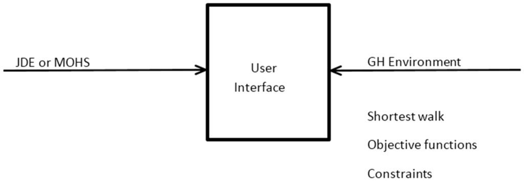 The MOHS algorithm has been programmed in the C-Sharp programming language. The necessary geometric and measurement operations required for formulating the objectives and constraints in our problem have been implemented in the Grasshopper design tool, which is a part of the Rhinoceros CAD product. This tool has been very useful in offering the necessary building blocks (such as the shortest path algorithm) for computationally implementing our problem. The C-Sharp algorithm makes use of this tool to calculate objective function values and constraint values. The summary of this process is shown in