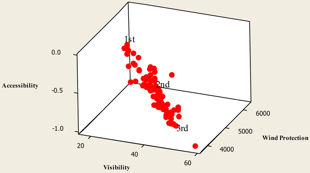 To achieve this objective in the model, the distances between desired functions and the protected regions are first calculated by Equations (11) and (12). Then Equation (13) provides the maximization of wind protection as follows: