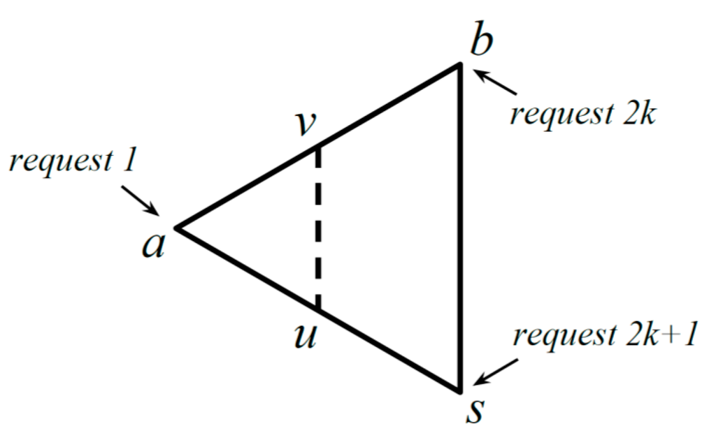 We describe our approach before more technical discussion in the subsequent paragraphs. In Figure 1, we illustrate the behavior of PQ against requests by our adversary. We assume that is slightly larger than . Points and are the centers of and , and and , respectively. For requests , PQ migrates its server along the dashed line, because does not move from . A request occurs at when the server is at , and a request occurs at when the server is at . Note that , , and tend to be the vertices of an equilateral triangle as approaches .