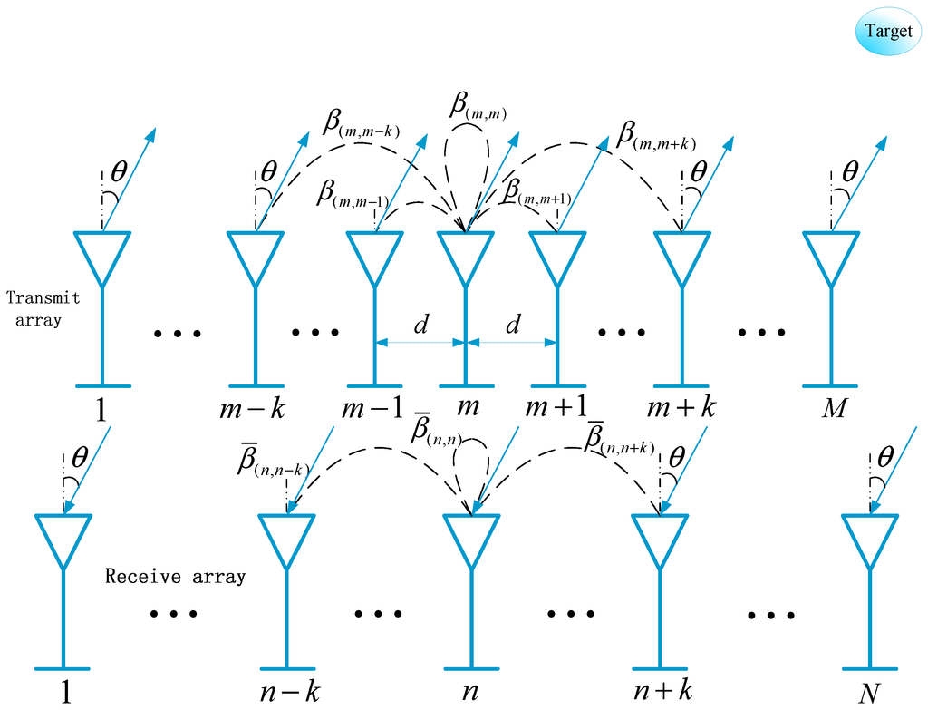 where , is the non-zero mutual coupling coefficient, . In Figure 1, the coupling effects of the m-th and the n-th elements in the transmit and the receive arrays are described, respectively. is the coupling contribution from the q-th to the m-th elements in transmit array, and is the contribution from the -th to the n-th elements in the receive array, , , and , . and contain the information of and , respectively. Mutual coupling coefficients are factors related to the distance between the two antennas [23], and for the non-zero coefficients, they satisfy . Besides, for the ULA coupling model, just a few mutual coupling coefficients are non-zero ones [22,23,24], and without loss of generality, is assumed. Then, by collecting J snapshots, the received data in MIMO radar with mutual coupling is represented as follows: