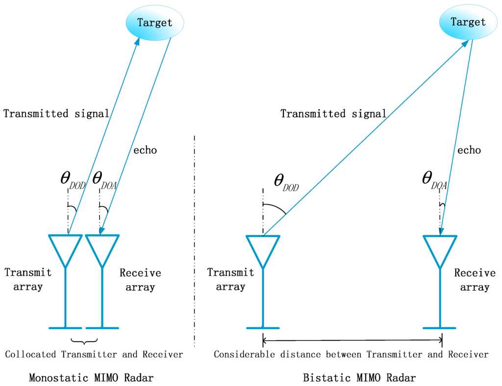 Difference between monostatic MIMO radar and bistatic MIMO radar.