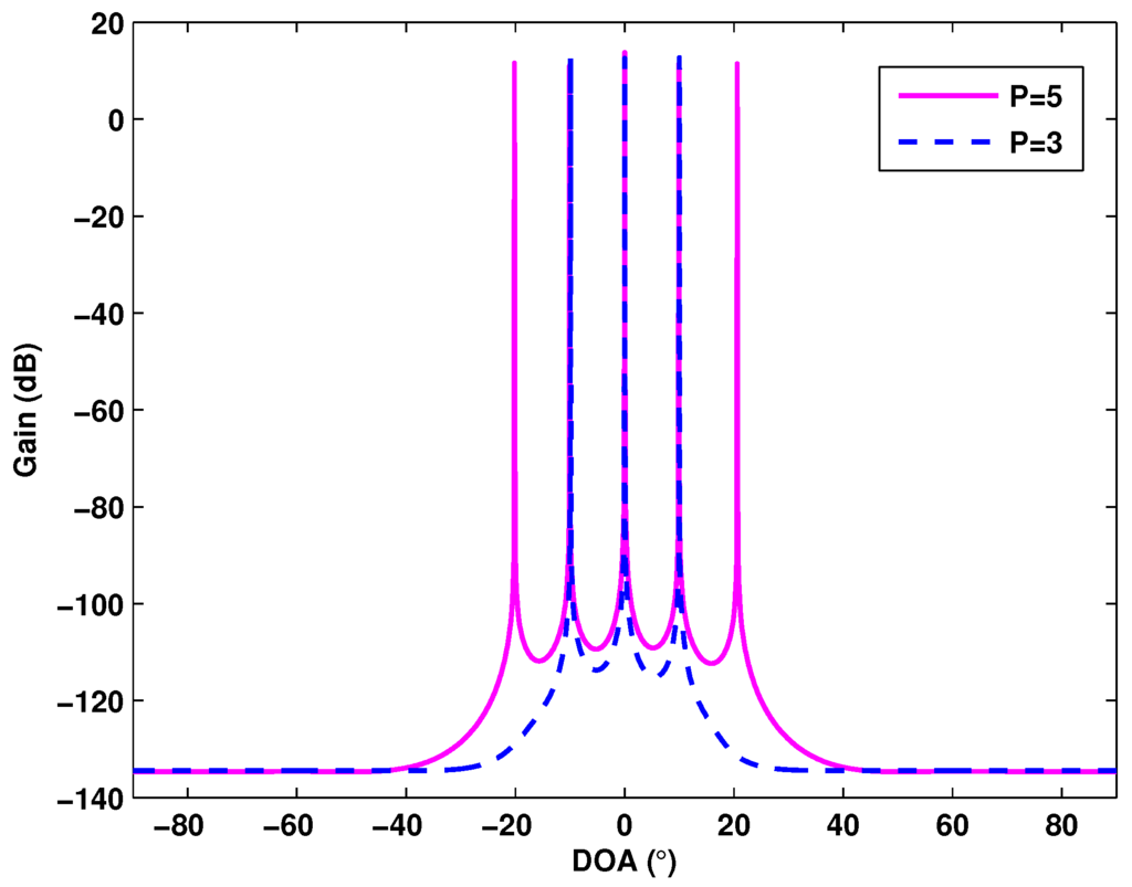 Effective SOC (second order cone) programming software packages, such as SeDuMi [27] and CVX [28], can be used to solve Equation (25). As a result, by plotting , the DOA estimation is achieved.