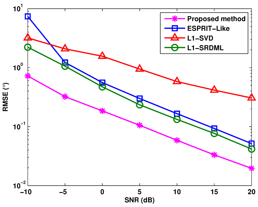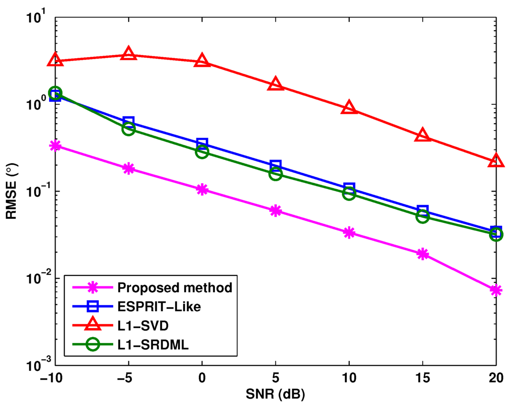 In this section, using the ESPRIT-like [14] algorithm, the -SVD [15] algorithm and the -SRDML [16] algorithm for comparison, some simulation experiments are implemented to demonstrate the efficiency and the advantages of the proposed algorithm. The signal-to-noise ratio (SNR) is defined as SNR = ). Let be the estimation of the true DOA for the i-th Monte Carlo trial; the root mean square error (RMSE) of angle estimation is defined as: