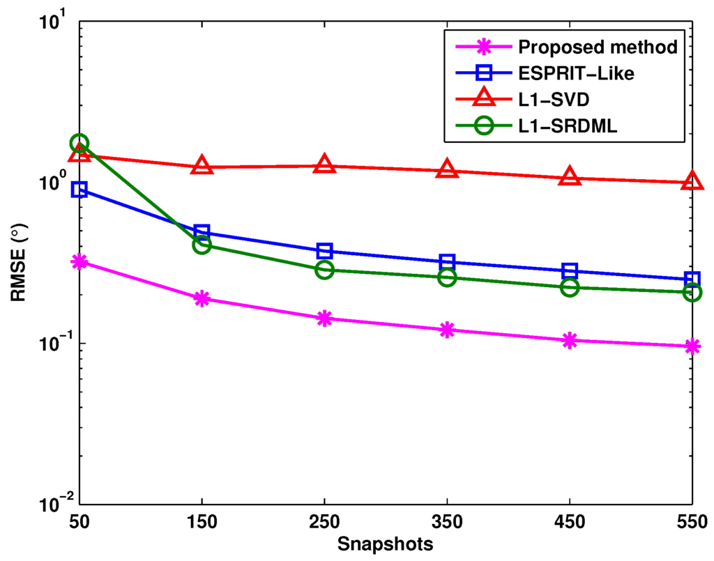 Figure 6 shows the RMSE of DOA estimation versus snapshots of different methods with mutual coupling Case (1), where , SNR = 0 dB, there are three uncorrelated targets with DOAs being , , and the number of snapshots varies from to . It can be seen from Figure 6 that the proposed method performs well in the case of fewer snapshots, and with obvious superiority over the ESPRIT-like, -SVD and -SRDML algorithms, the proposed method performs the best in all pf the ranges of snapshots on account of the application of the reweighted matrix and the noncircularity of emitted signals.