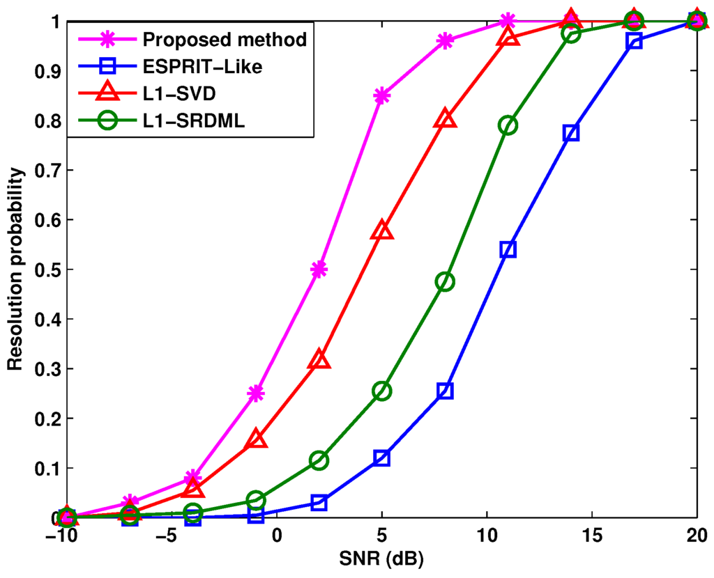 Figure 7 demonstrates the target resolution probability of different methods versus SNR with mutual coupling Case (1), where , and the DOAs of three targets are , and , respectively. They can be regarded as successfully detected when all of their absolute DOA estimation errors are within . It can be observed that when SNR is high enough, all methods provide target resolution probability. Owing to the increased number of virtual array elements, more diversity gain is obtained in the proposed algorithm. Consequently, the proposed method provides higher resolution probability than the ESPRIT-like, -SVD and -SRDML algorithms in all SNR regions, as shown in the simulation results of Figure 7.