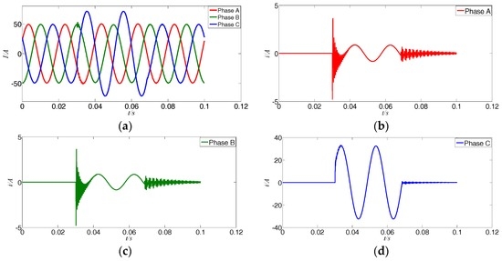 (a) Three-phase currents of a single-phase A grounded fault; (b) Fault component of phase A; (c) Fault component of phase B; (d) Fault component of phase C.