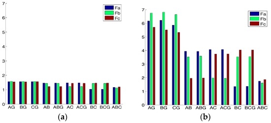 For the 10 detailed classes of the short circuit faults, the fault features using the traditional box dimension and the improved box dimension are shown in Figure 3a and Figure 3b respectively. The horizontal axis represents the short circuit faults which include the 10 classes of short circuit faults. AG, BG, and CG are the single-phase short circuit faults. AB, BC, and AC are the phase-between short circuit faults. ABG, BCG, and ACG are the double-phase short circuit faults. ABC is the three-phase short circuit fault. The vertical axis is the fault feature values. The blue color represents phase A, the green color represents phase B, and the red color represents phase C.