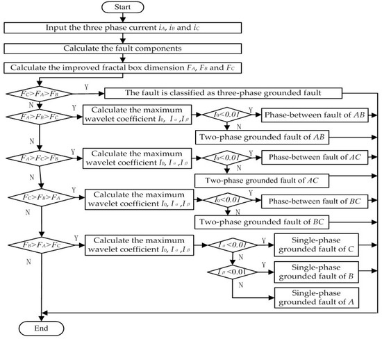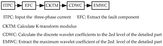 Based on the experiments, the wavelet Db3 were used to analyze the modulus components of α, β, and 0 for the different faults. The maximum wavelet coefficients I0, Iα, and Iβ are listed in Table 4 for the 10 types of short circuit faults. The flow chart of the calculation of the maximum wavelet coefficients [31] is shown in Figure 4.