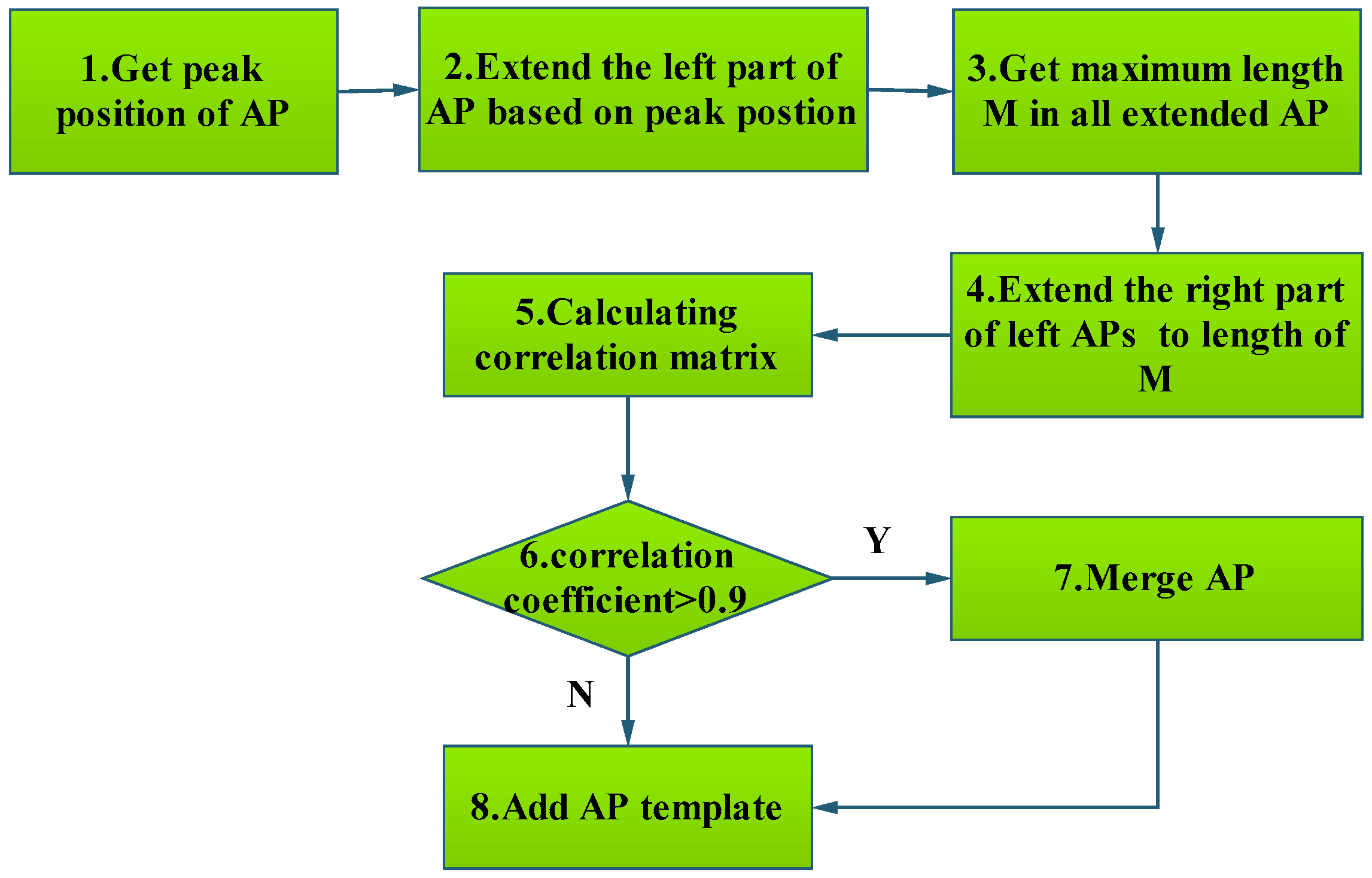 We begin with an initial set of N random templates (APs) and the amplitude is transformed to be positive by subtracting the minimum value for every AP, then normalize the APs by Equation (2), and align all peaks based on the peaks’ position by extending all AP waveforms, as shown in Figure 2. Next, we calculate the PCC in Equation (2) to classify the type of APs. If PCC between two APs is bigger than 0.9 (p < 0.01), they are similar, then merge them into one AP by calculating the average value of two APs.
