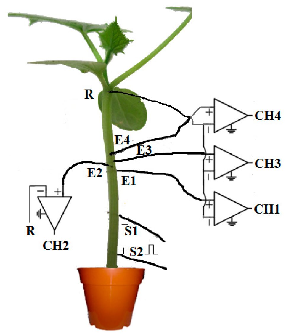 - Zhao, D.J.; Wang, Z.Y.; Li, J.; Wen, X.; Liu, A.; Huang, L.; Wang, X.D.; Hou, R.F.; Wang, C. Recording extracellular signals in plants: A modeling and experimental study. Math. Comput. Model. 2013, 58, 556–563. [Google Scholar] [CrossRef]