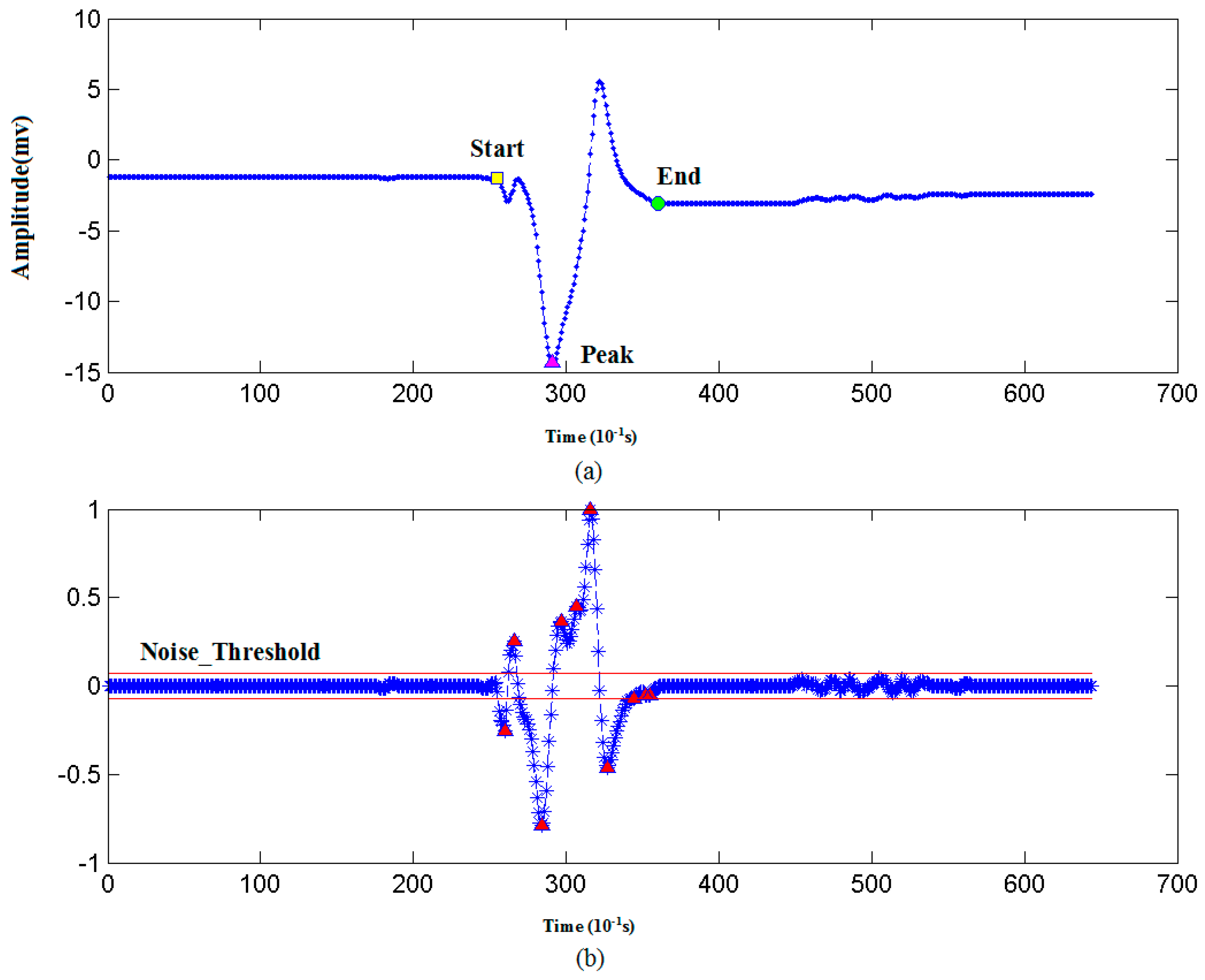 To determine the starting point, end point, and peak point of signal, the noise peaks threshold is initiated as 0.1 mV/s at first. Then after every first-order derivative, the noise peaks threshold is updated by the following method. We set the new noise peaks threshold as the sum of 0.75× old noise peaks threshold and 0.25× average of new noise peaks.
