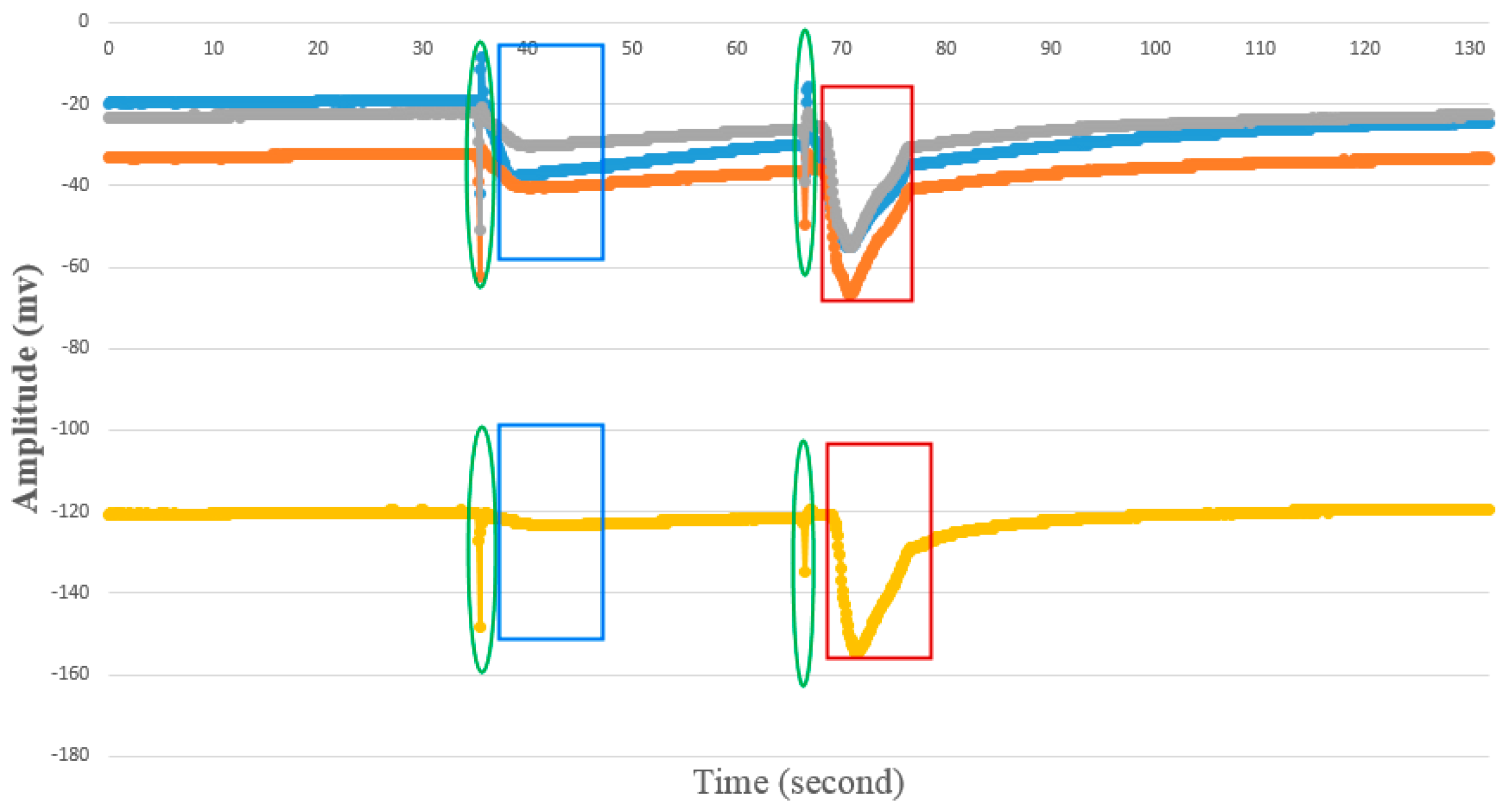 Changing of environmental conditions or stress will effect on the plasma membrane potential of plant cells. As is well known, plant action potential (AP) is a rapid response to abiotic and biotic stresses [23]. It is generated by the movement of ions (Cl−, Ca2+, K+, H+) through a cell membrane. Ions move via different ion channels and pumps in the plant, under the control of concentration and electric gradients [8,24].