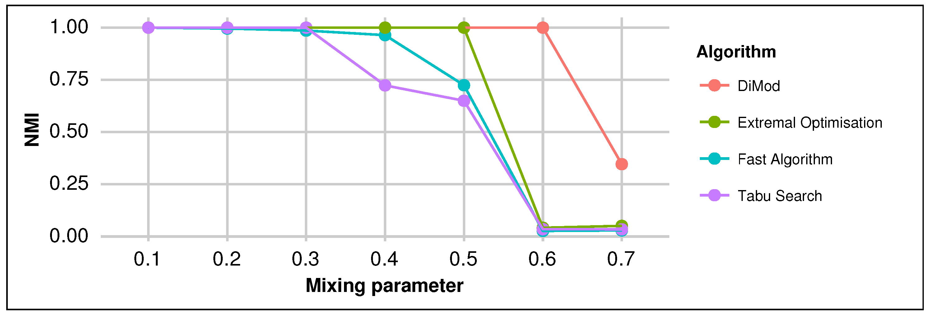 - Lancichinetti, A.; Fortunato, S. Benchmarks for testing community detection algorithms on directed and weighted graphs with overlapping communities. Phys. Rev. E 2009, 80, 016118. [Google Scholar] [CrossRef] [PubMed]