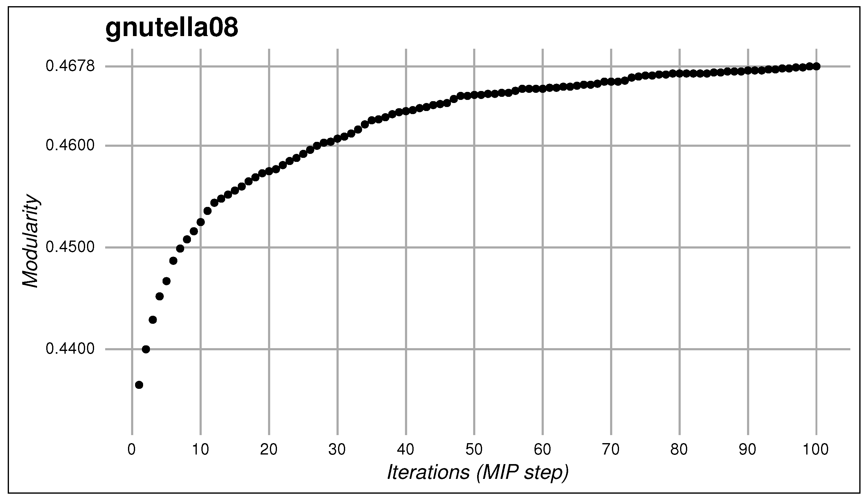 - Cafieri, S.; Hansen, P.; Liberti, L. Improving heuristics for network modularity maximization using an exact algorithm. Discret. Appl. Math. 2014, 163, 65–72. [Google Scholar] [CrossRef]