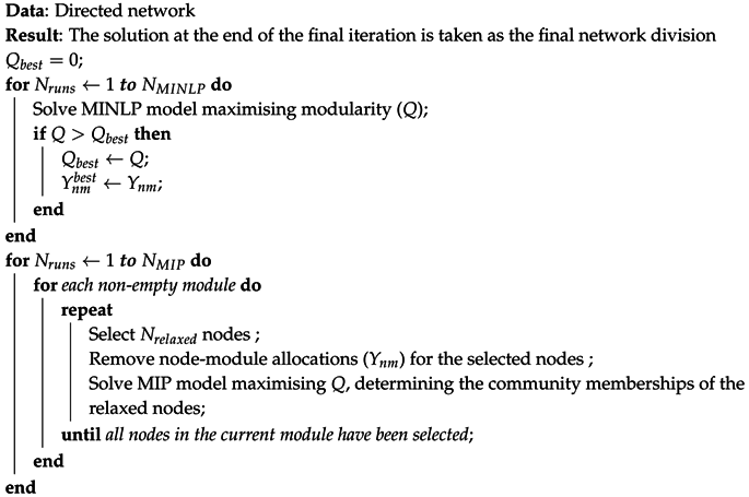 The proposed algorithm has three user-defined parameters: , the number of iterations for the MINLP model; , the number of iterations for the MIP model and , the number of nodes to be released for each module at each MIP run. The optimal number of modules is determined by the algorithm itself, but we set a maximum number of modules to generate the set m. After the first model is solved times, the best value of modularity () and its corresponding partition () are selected and used in the second model. At each iteration of the MIP, nodes are allowed to change modules, while the remaining nodes are kept in their previous modules. Each node within the current module is relaxed once only and the procedure of random node selection and re-allocation continues until all the nodes within the current module have been relaxed. In our preliminary tests, we have found that provided the best compromise in calculation time and quality of solution for networks of different sizes. The full proposed model is summarised in Algorithm 1.