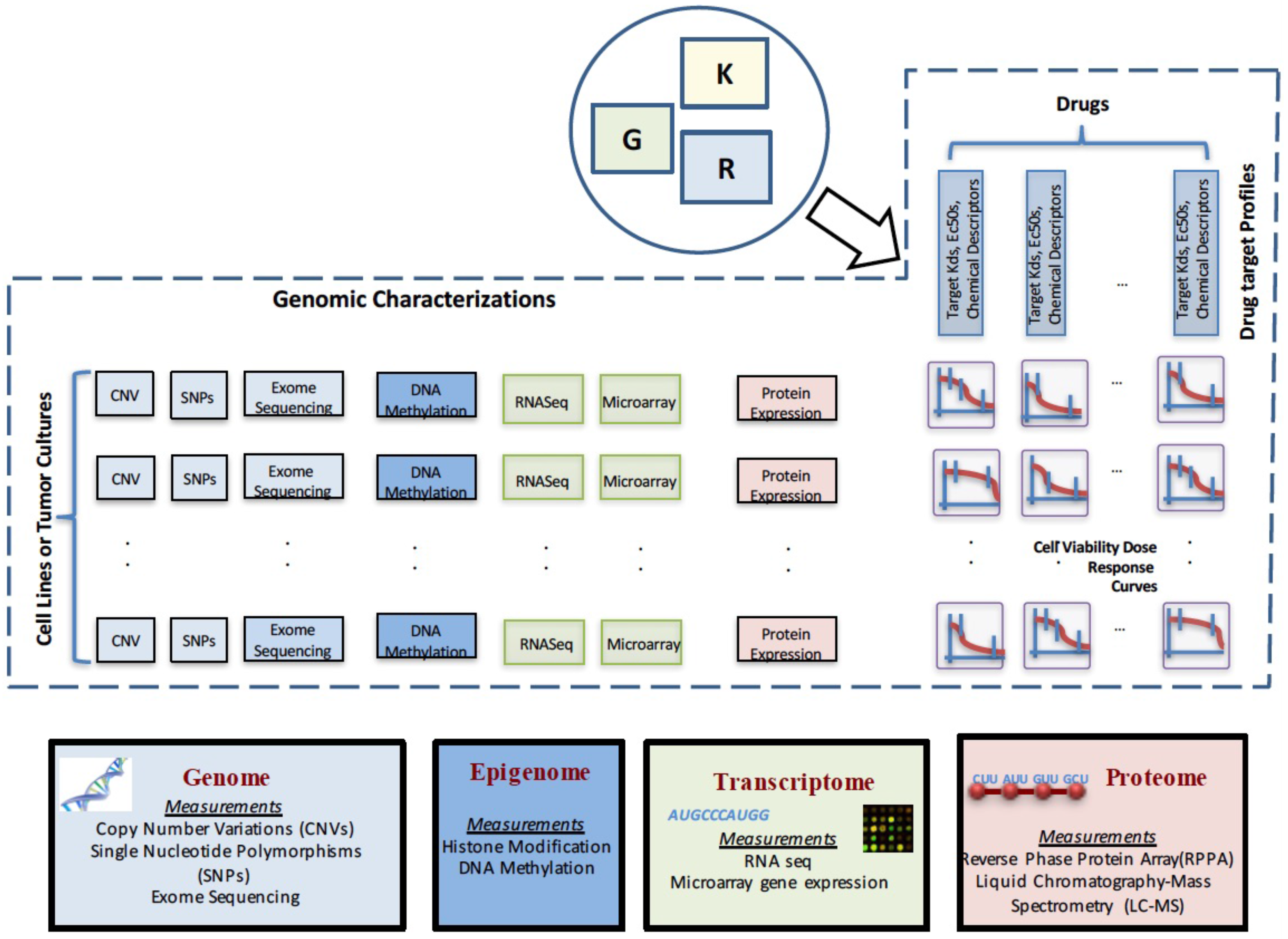 Pictorial representation of the commonly-used genomic and functional characterizations and data types used for drug sensitivity prediction.