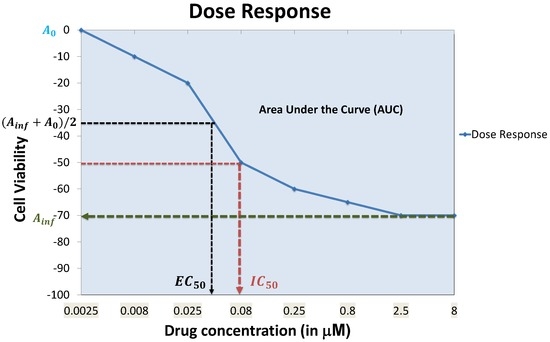 where and represent the minimum and maximum reduction in cell viability, represents the drug concentration required to reach 50% of (average of the minimum and maximum cell viability attainable by the drug) and h is the Hill slope. Rather than using the entire cell response curve as the measure of sensitivity, a specific feature of the curve such as AUC (Area Under the dose response Curve) or (drug concentration required to reduce cell viability to 50% of initial response) is used to represent sensitivity. The IC’s are usually converted to sensitivity values between zero and one using a logarithmic mapping function, such as [31,32].