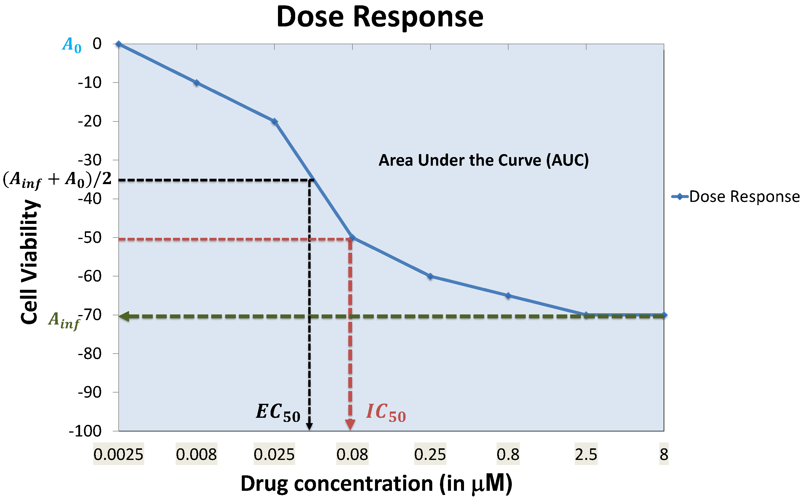 Each feature of the dose response curve can produce its own set of concerns. For instance, for responses where 50% cell viability cannot be reached, is often equated to , which does not capture the exact behavior of the dose response curve. AUC can be problematic when low doses are used and an initial increase in cell viability is observed, which will result in negative portions for the AUC.