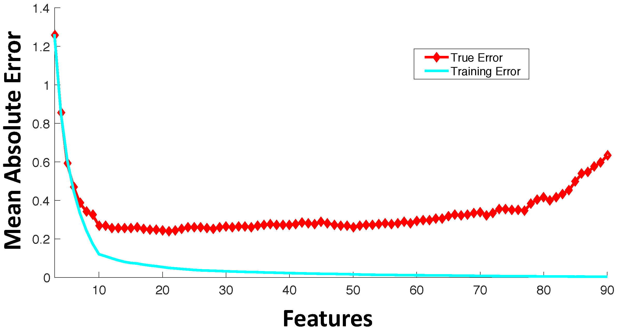 A significant number of current drug sensitivity studies use high throughput technologies to collect information from various genomic levels resulting in extremely high dimensional genomic characterization datasets. For instance, the Cancer Cell Line Encyclopedia study [23] has >50,000 features representing mRNA expressions and mutational status of thousands of genes. Since only a small set of these features is important for drug sensitivity prediction and the number of samples for training is significantly less than the number of available features, direct application of machine learning tools on all of these features can result in model overfitting. Figure 3 shows an example trajectory for training error and generalization error with the increase in the number of features. The synthetic example was created with 100 random samples of 90 features each where the output response is dependent only on the first 10 features. The true error was estimated based on the additional holdout of 300 samples with the model trained using 100 samples. This example with synthetic data was created to illustrate the effect of overfitting with increased model complexity. Figure 3 shows the average behavior over 100 random simulations. Since our output response is only dependent on the first 10 features, we note that the validation error keeps increasing when the number of features is increased beyond 10. After a point, the addition of more features in modeling can be detrimental from the prediction accuracy perspective. If the model complexity (in this case, represented by the number of features) is high relative to the number of training samples, the estimated model can fit the training data precisely, but can produce a large error when predicting unseen data (generalization error). Note that in drug sensitivity studies, the number of features is usually significantly higher (in the range of –) as compared to the number of samples (in the range of 60–1000), and thus, overfitting is a highly pertinent problem.