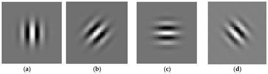 Gabor wavelet based on different directions. (a) θ = 0, (b) θ = π/4, (c) θ = π/2, (d) θ = 3 × π/4.
