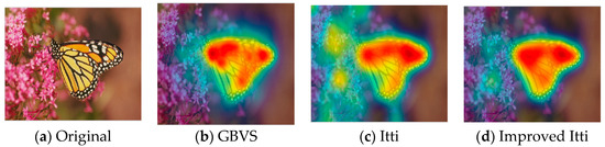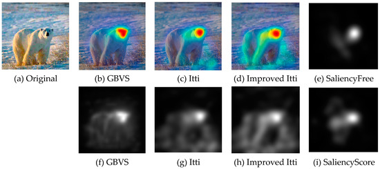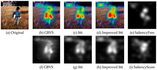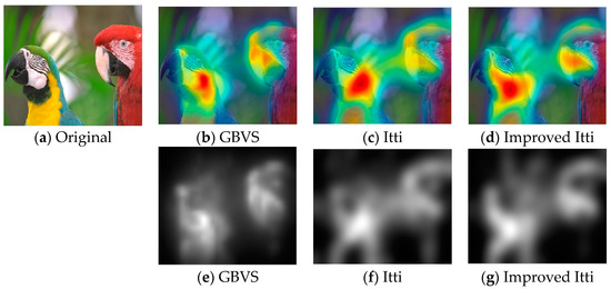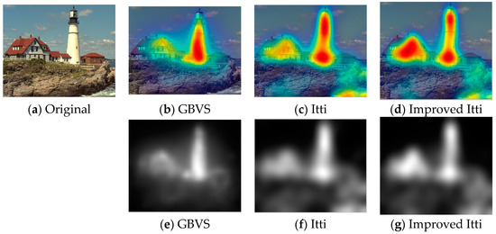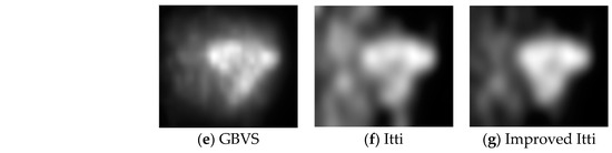 Nowadays, a number of computational models to simulate human visual attention have been studied by scholars and some powerful models have been proposed. For further details of ROI refer to [9,10,11,12,32,33,34,35,36]. In [33], Itti et al. proposed a visual saliency model which was the first influential and best known visual saliency model. In this paper, we call it Itti model. Itti model mainly contains two aspects. Firstly, they introduced image pyramids for feature extraction, which makes the visual saliency computation efficient. Secondly, Itti et al. proposed the biologically inspired “center-surround difference” operation to compute feature dependent saliency maps across scales [32]. This model effectively breaks down the complex problem of scene understanding by rapidly selecting. Following the Itti model, Harel et al. proposed the graph-based visual saliency (GBVS) model [37]. The GBVS was introduced a novel graph-based normalization and combination strategy, and was a new bottom-up visual saliency model. It mainly consists of two steps. The first step is forming activation maps on certain feature channels. In addition, the second step is normalizing them in a way which highlights salient and admits combination with other maps. Experimental results show that the GBVS predicts ROI more reliably than other algorithms.