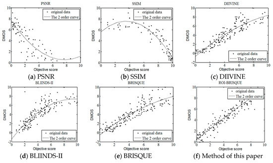 Scatter plots of DMOS versus different model predictions. Each sample point represents one test image in the entire LIVE database. (a) PSNR model; (b) SSIM model; (c) DIIVINE model; (d) BLIINDS-II model; (e) BRISQUE model; (f) Model of this paper (ROI-BRISQUE).