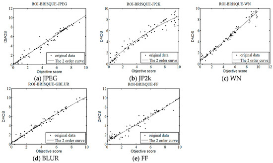 As a whole it is obvious that ROI-BRISQUE performs well in terms of correlation with human perception, and is competitive with the BRISQUE across distortion types. From Table 5, it can be seen that the ROI-BRISQUE algorithm outperforms the BRISQUE indices in the five different types of distortion. This is a remarkable result, as it shows that algorithms that operate without any reference information can offer performance competitive with the predominant IQA algorithm over the last decades. Figure 14 is scatter plots of five categories. It can be shown that the proposed method has higher accuracy and stability than conventional image quality evaluation methods.