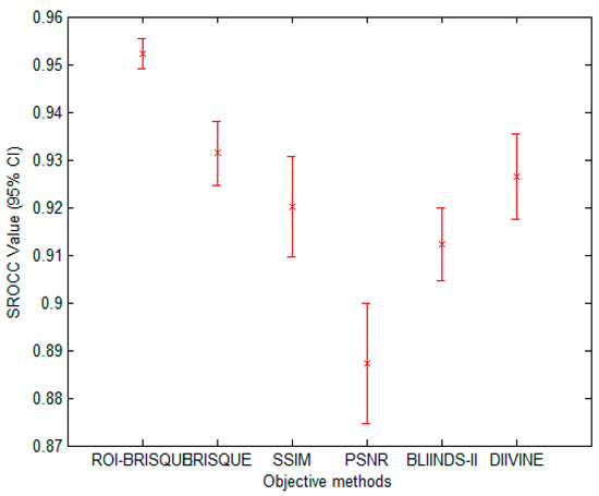 We also listed the median correlation values of ROI-BRISQUE as well as other PSNR, SSIM DIIVINE, BLIINDS-II and BRISQUE algorithms. Although the experiment results show some differences according to the median correlation, in this part we evaluate if these differences in correlation is statistically significant. To visualize the statistical significance of the comparison, we show error bars of the distribution of the SROCC values for each of the 1000 experimental trials. The error bars indicate the 95% confidence interval for each algorithm [50]. Plots are shown in Figure 15. Obviously, the lower the confidence interval with a higher median SROCC, the better the performance is. The plots show that the ROI-BRISQUE is not statistically significantly different in performance. In addition, in order to evaluate the statistical significance of performance of each algorithm, we use one-sided t-test between those correlation values [50]. We tabulate the results of such statistical analysis in Table 6. The null hypothesis is that the mean correlation for the row is equal to the mean correlation for the column at the 95% confidence level [51]. The other hypothesis is that the mean correlation of the row is greater or lesser than the mean correlation of the column. In the Table 6, the value of “1” indicates that the row method is statically superior to the column method, “−1” indicates that the row method is inferior to the column method, and “0” indicates that the row and the column methods are equivalent.