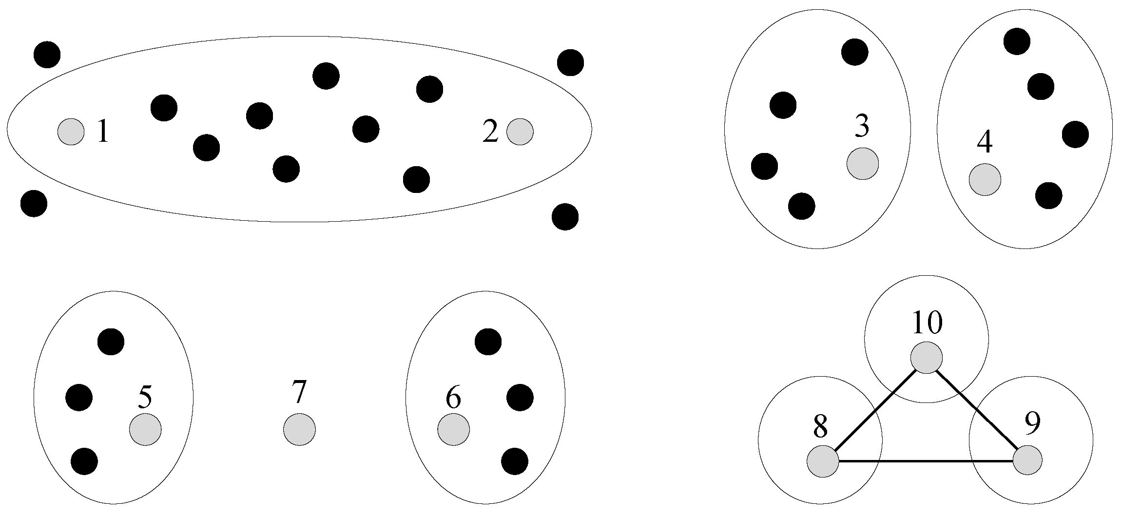 Which question (i.e., pair of data points) should the machine ask? Suppose the machine is in the middle of the cluster-building process. Then, Figure 1 shows some interesting cases as follows: (1) data points 1 and 2 are currently in the same cluster, but the distance between them is large. Hence, the machine may want human assistance to check their assignment; (2) data points 3 and 4 are currently in different clusters, but the distance between them is small. These two clusters that contain 3 and 4 may merge into a larger one; (3) the data point 7 is in the middle of two clusters. The machine can decide whether to add 7 to 5’s cluster or 6’s cluster, by asking the human two questions. Moreover, this problem is further complicated, due to the transitive relations of questions. As shown in Figure 1, let us assume that two questions return answers (from the human) in which data points 8 and 10 (the first question’s answer), as well as 9 and 10 (the second question’s answer), are in the same cluster. Based on these answers, the machine can derive that 8 and 9 are in the same cluster by transitivity.