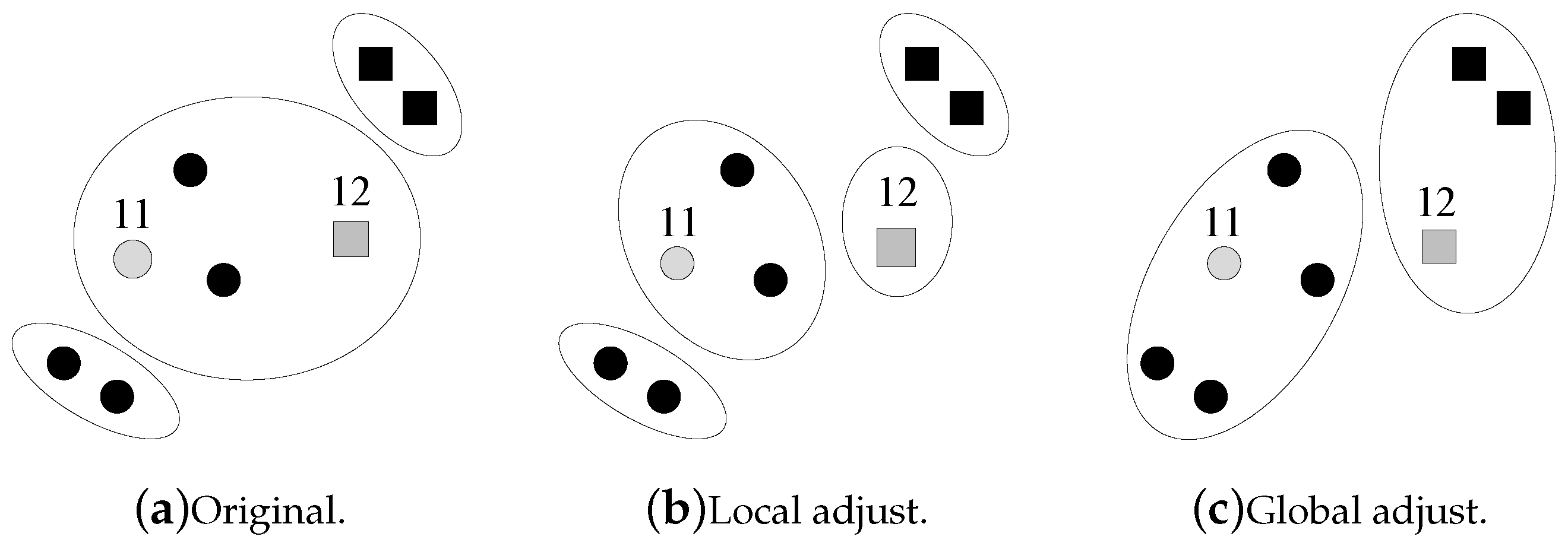 This subsection focuses on the “how” problem. Once the human’s answer disagrees with the machine’s result, the machine should adjust its clustering result, which is complex due to the coupled errors. Suppose i and j are the most questionable pair of data points in the estimated-dirtiest cluster C, where the human’s answer disagrees with this result. Local adjustment refers to the case where the machine splits C into two clusters that, respectively, include i and j. Global adjustment refers to the case where the machine gives up the current result and re-starts the clustering from the beginning. Local adjustments have a low time complexity and a low accuracy, while global adjustments have a high time complexity and a high accuracy.